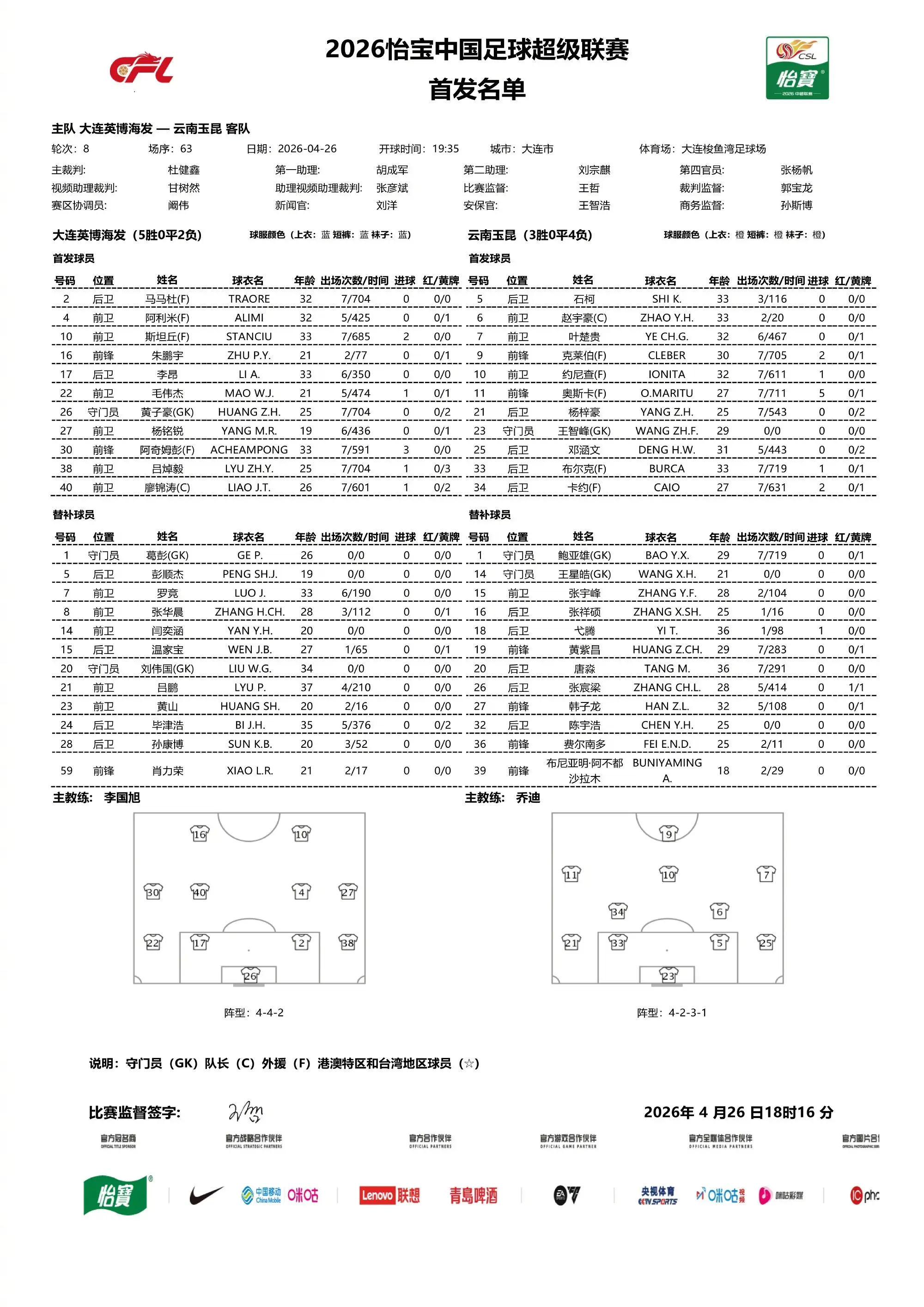 虎扑04月26日讯 北京时间今天19:35,中超联赛第8轮,大连英博坐镇主场迎战云南玉昆,赛前双方公布首发阵容。